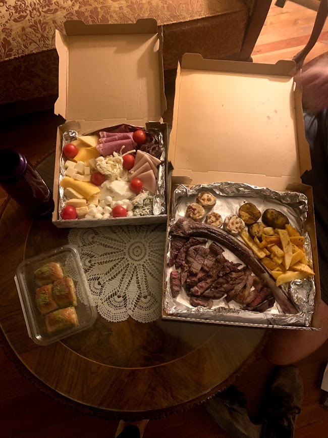 - Exchange Rate – Turkey is the Mexico of Europe. It is hard to look at an exchange rate and understand what the value of it truly is. The dollar to lira was roughly 1 to 10, however we’ve been to countries like Japan where everything was fully adjusted in price. Turkey was not the case. Everything was incredibly cheap, most notably the amazing food. We went to Turkey over the Thanksgiving holiday (funny, right?) and that holiday is one we always spend with family. It was a bit of a bummer to not be with them for Thanksgiving Dinner, however we asked the owner/manager of Esbelli Evi to order us in our own version of thanksgiving from Il Gusto. We ended up getting a charcuterie plate, salad, 30oz tomahawk steak, hummus, and a dessert for $30 USD. It was incredible. We were able to really try a bunch of different food without breaking the bank.