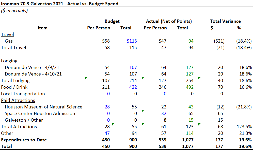 We ended the trip with $177 over our planned budget. There wasn’t one particular monetary surprise during the trip, and largely due to the extra spending that comes along with being “on vacation” that makes us more spendy in general. Galveston is an affordable place to visit, particularly weekends outside of race weekend. See below how our spending compared to budget on an itemized level: