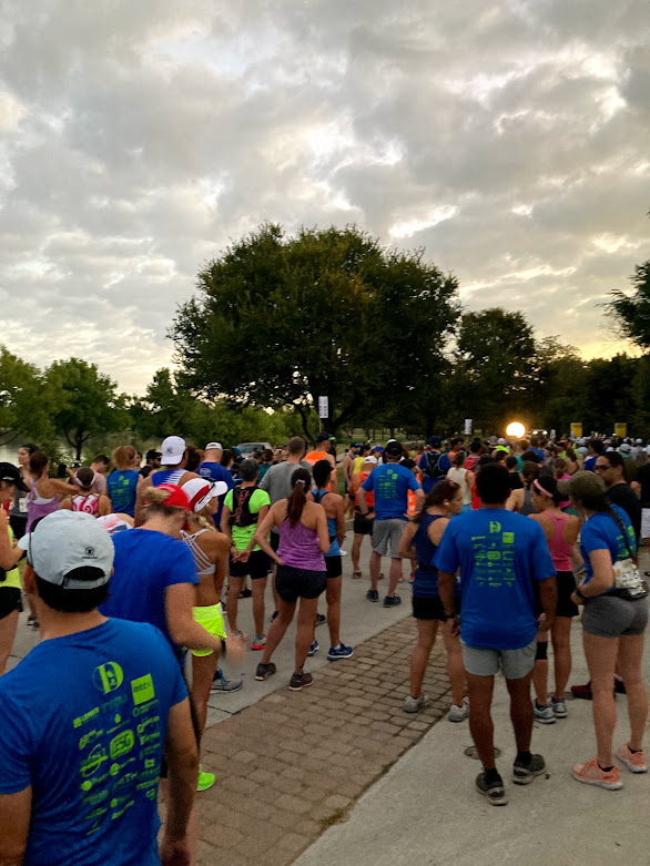 We arrived about 15min before the gun went off at 7am and got in the last bit of hydration and bathroom we needed as we walked over to the start line at the bottom of the outdoor amphitheater. The Dallas Running Club graciously volunteers each year to run pace groups, so we weaved our way through the crowd to get to the 2:15 group. In the very short amount of time between us lining up and the gun going off, a woman came up behind us and asked why my dad and I were wearing our JDRF shirts. Could it be a new friend?? Dad and I intentionally coordinated to get a photo op to post on our family’s JDRF Fundraising Page, the charity that we are running with for the New York City Marathon. As it turns out, this woman named Leigh was on the same exact charity team for the NYC Marathon as well! There are only a small handful of us in the state of Texas and what are the odds we ran into each other at the start line? Pure serendipity.