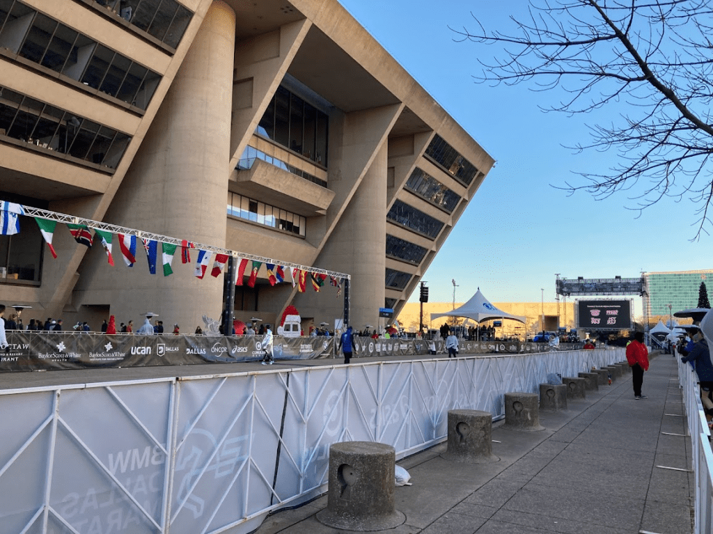 It was a freezing 32 degrees and with a hot drop on I-30 and Akard Street, I arrived a little over an hour before start gun. There was plenty opportunity to scope out the start, use the bathroom and do packet drop off. The starting area is very spread out with ample bathrooms alongside City Hall and clearly marked packet drop off tents. There are even changing tents and heat lamps in the concourse, so I huddled under a heat lamp for the better part of 20min. Around 8am (and 45min from my start time) I finally stripped my extra pants and jacket, put everything in my bag for bag check and hopped in my corral. The corrals line up in different street blocks, so it appears like there is nobody out running the race. Entire corrals are tucked behind skyscrapers going down different blocks.