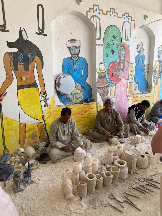 Alabaster is a type of stone, traditionally white, that artisans carve into statues or practical homewares. There are many alabaster shops along your drive out to The Valley of the Kings that have beautiful handmade works. I was seriously considering getting a few serving platters before my small carryon suitcase came to mind. They have a lot of colors as alabaster can be dyed. Just double check what has been machine made versus hand carved before you buy.