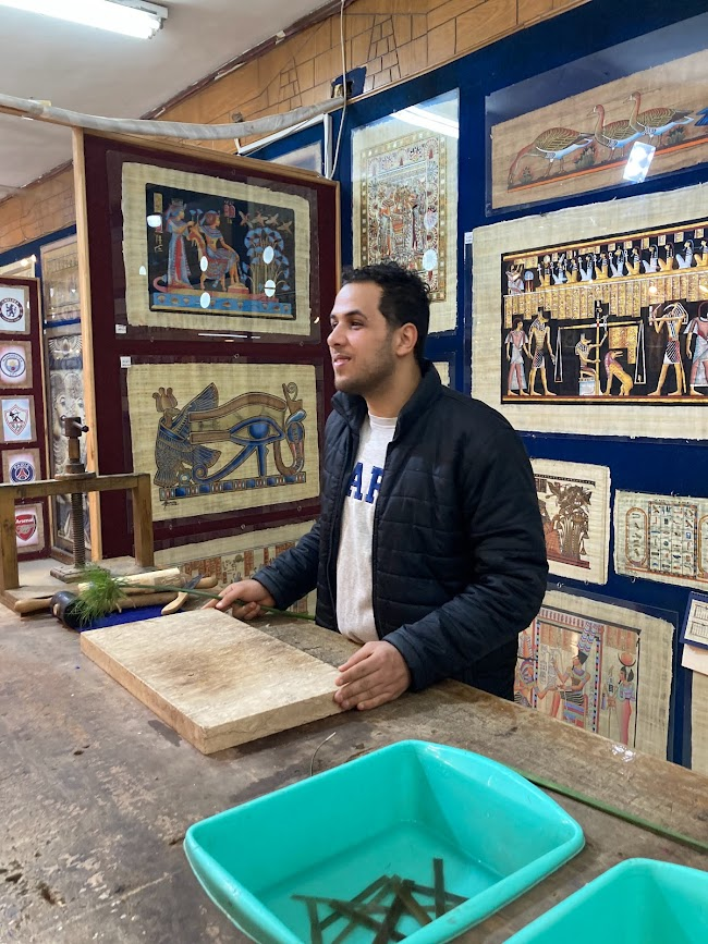 We were taken by our guide to a Papyrus Museum (aka shop) on our first day in Cairo. The actual demonstration of cutting, soaking and weaving the reeds was very interesting to see. The paper itself is very tough and sturdy. This is the one item we brought back that I’m not worried about showing to my nieces (ages 6 and below) since they wouldn’t be able to rip it up or destroy it without solid effort. The cool thing is we spent $10 USD for a small page of a traditional Osiris weighing of the conscious scene. It was both a piece of Egyptian history and on the original form of paper.